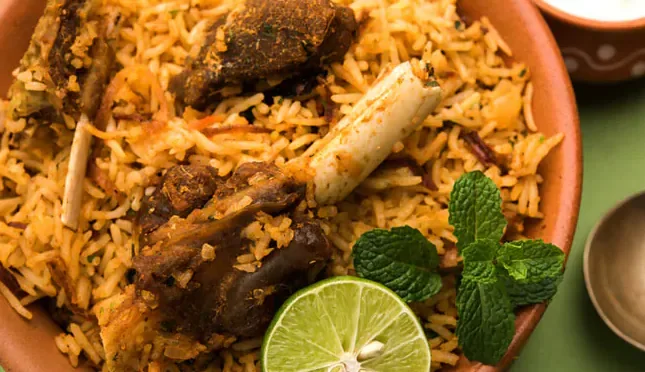 Hyderabadi biryani (also known as Hyderabadi dum biryani) is a style of biryani originating from Hyderabad, India made with basmati rice and meat (mostly goat meat). Originating in the kitchens of the Nizam of Hyderabad, it combines elements of Hyderabadi and Mughlai cuisines. Hyderabad biryani is a key dish in Hyderabadi cuisine and it is so famous that the dish is considered synonymous with the city of Hyderabad. The exact origin of the dish is uncertain. Despite legends attributing it to the Nizam’s chef, the biryani is of South Indian origin, derived from pilaf varieties brought to South Asia by Arab traders. Pulao may have been an army dish in medieval India. Armies would prepare a one-pot dish of rice with whichever meat was available. The distinction between “pulao” and “biryani” is arbitrary.[9][10] Hyderabadi biryani incorporated Deccani or Telangana flavors of, perhaps in the Nizam’s kitchen.